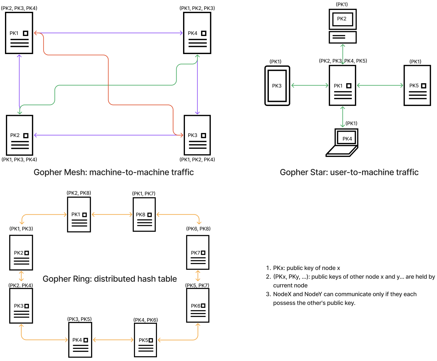 Gopher Method: Gopher Topology uses end-to-end encryption, with each node generating a key pair for secure communication. Traffic is encrypted using private keys and can only be decrypted by the corresponding public key held by the communication partner.